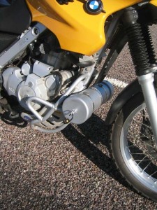 Both bikes sport rear brake protectors. On the standard GS, the rear brake stop (a small rectangular metal lug that sticks out from the frame and stops the rear brake pedal) is easily snapped in even light tumbles, where the brake pedal can be pushed upwards to shear the lug.